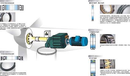 Yaw Bearing System: wind power installed base assembly cabin yaw agencies for accurate and timely adjustment of the fan angle of the wind, and lightning conduction to the ground, carrying the full weight of main drive fan (axial radial load load and overturning moment). Requires good sealing performance, high reliability, stable operation and good flexibility and surface corrosion life of more than 20 years and so on. This kind of bearings generally use large four point contact or cross cylindrical roller wheel bearings.